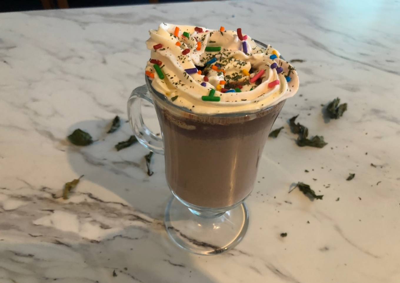 - Calentar a fuego lento y dejar caer las hojas de menta y chocolate.