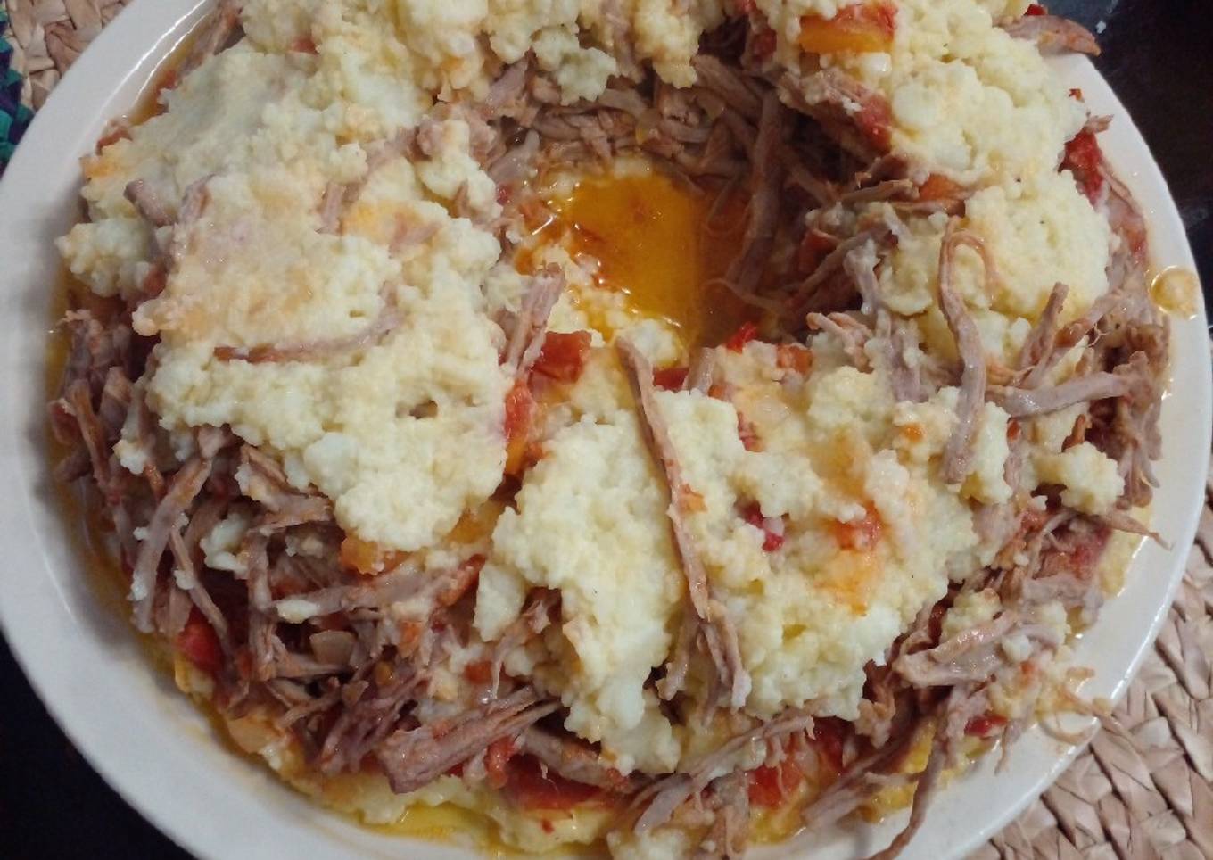 - Ahora engrasa un molde de rosca con mantequilla y después pones la mitad de la mezcla de papa en todo el molde, agrega cuadritos de mantequilla dispersos en todo y la mitad del queso manchego, seguida por la mezcla de la carne deshebrada ya guisada y por último agrega la papa restante, más cuadritos de mantequilla y el resto del queso manchego, acomoda bien en el molde y mete al horno convencional o eléctrico a 180°C hasta que ya se vea doradito y listo a comer.
