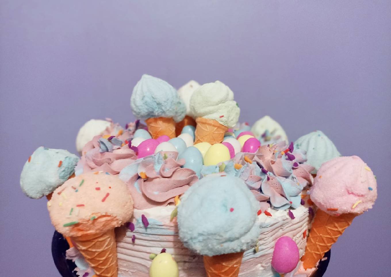 - Sacamos el pastel, para así batir más crema y pintarla de los colores que más te gusten, en este caso pinte morado, rosa y azul
