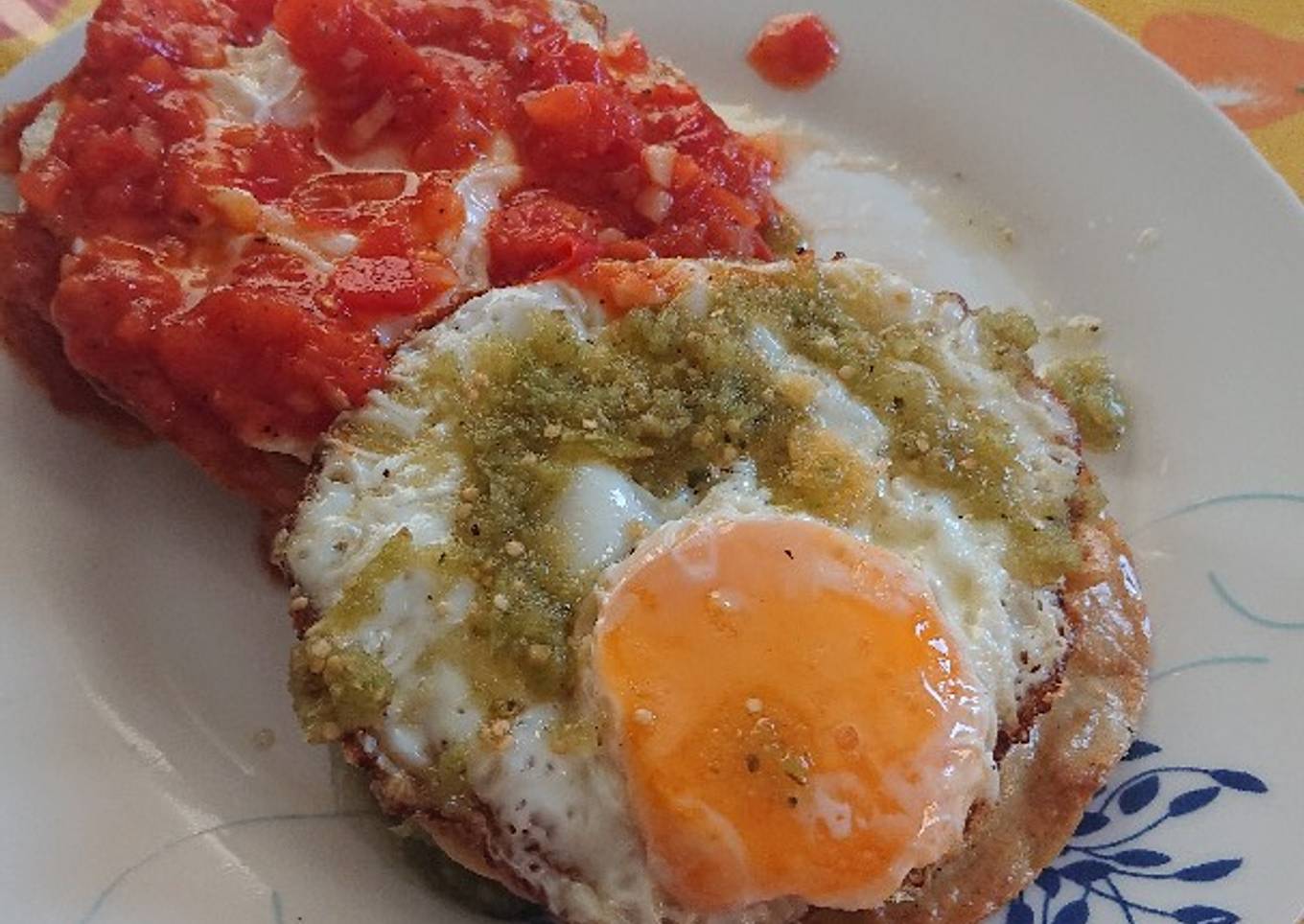 - Pones los huevos sobre las tortillas y baƱas cada uno de salsa diferente.