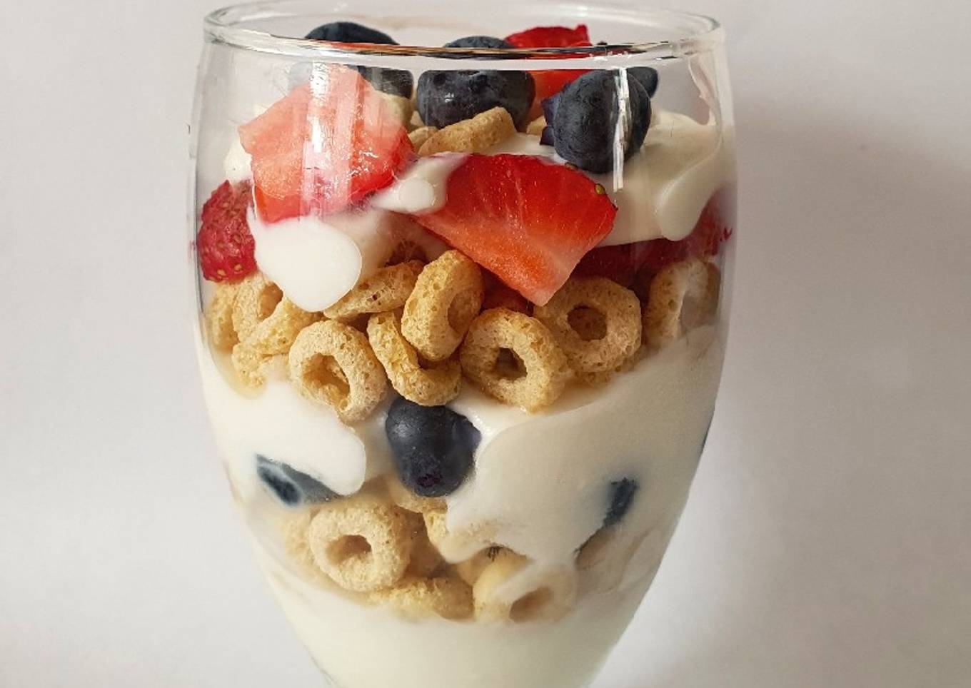 - A continuación agregamos una capa de cereal y fruta de tu elección.