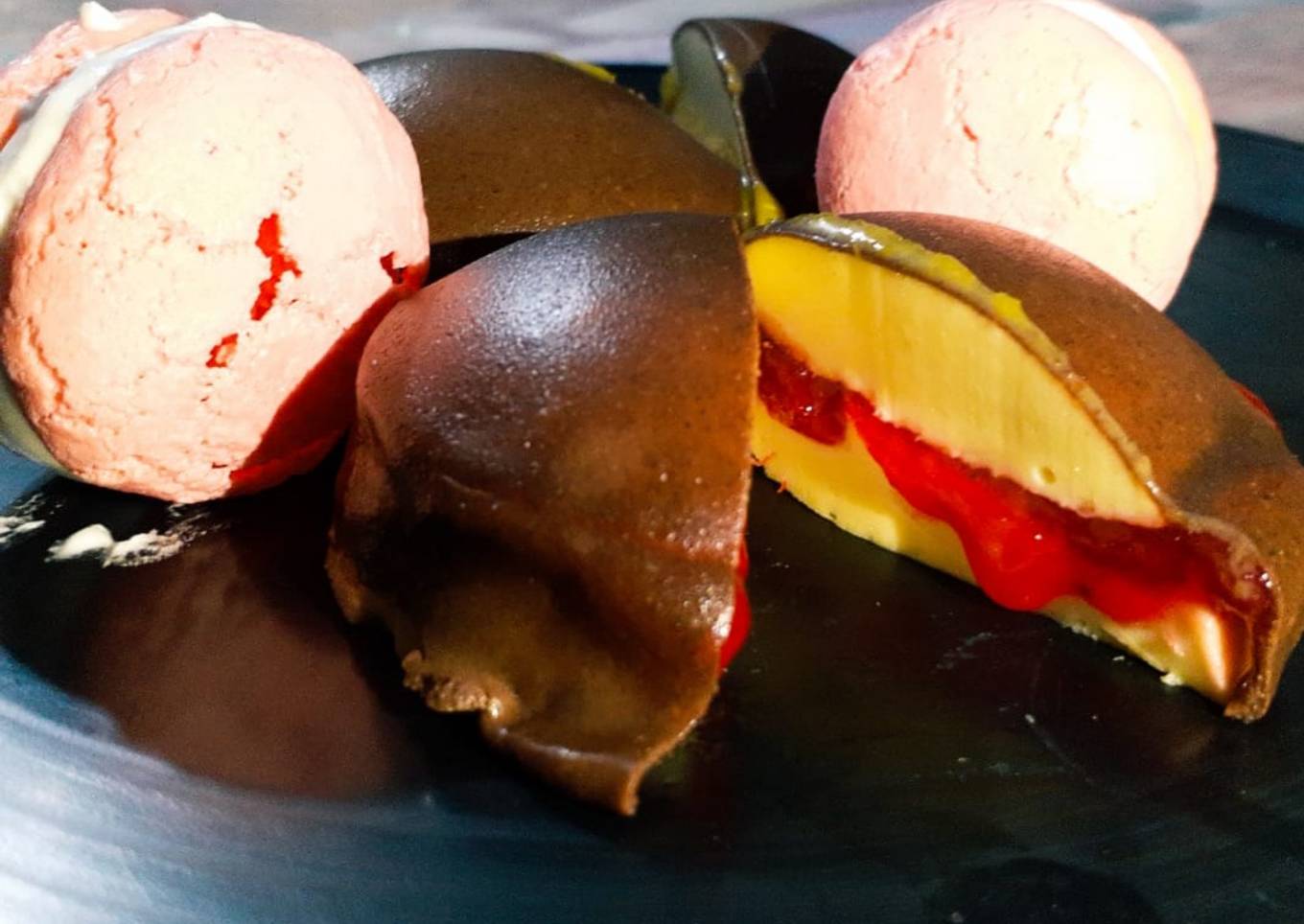 - Finalmente agregamos la grenetina previamente hidratada y fundida en baño maría y cubrimos nuestras medias esferas de mousse y dejamos refrigerar.