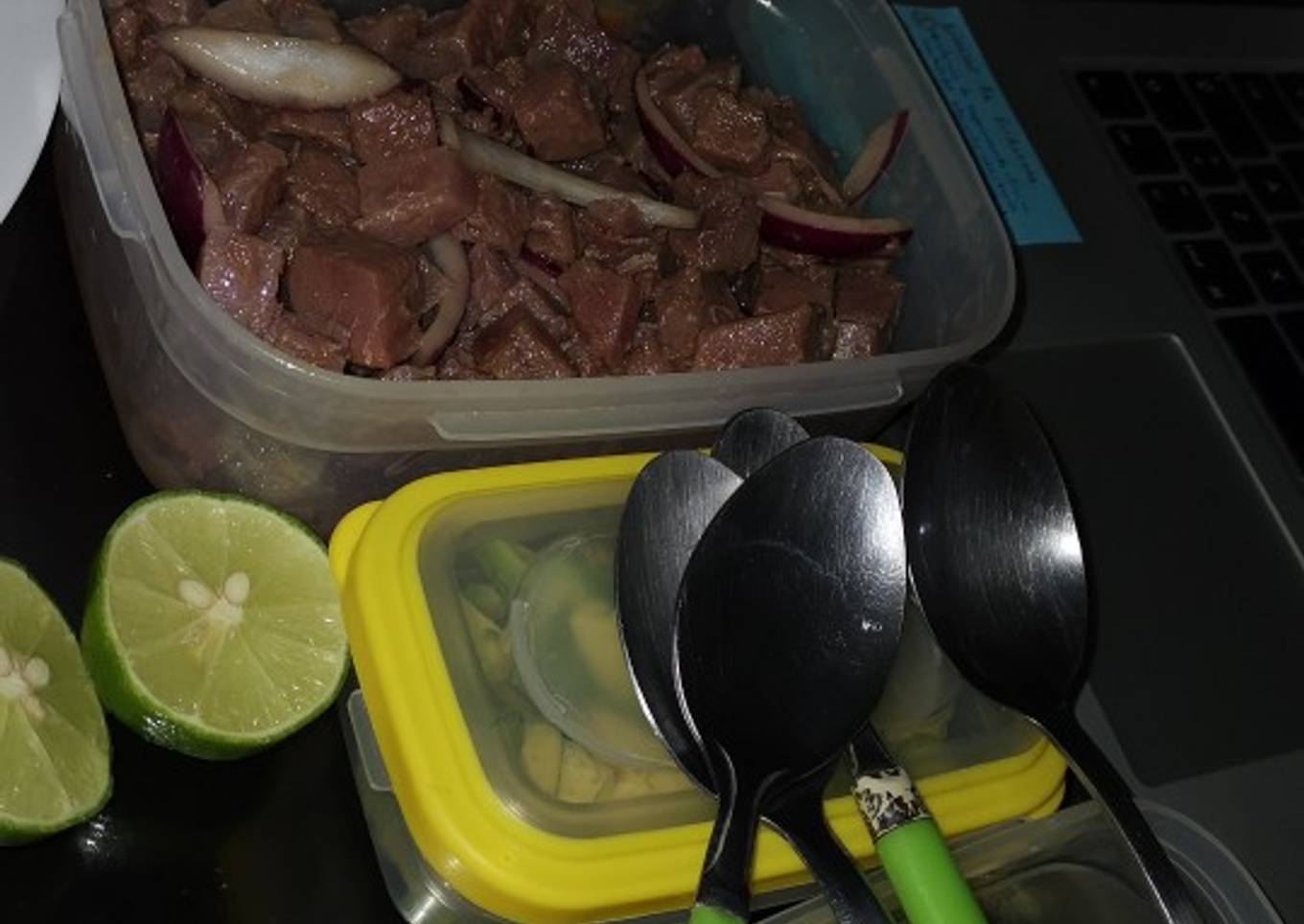 Dejamos reposar unos minutos. - Cuando ya estemos listos para servir, colocamos los cuadritos de Atún con nuestra salsa para marinar. Los dejamos de 2-5 min marinando y armamos la tostada.