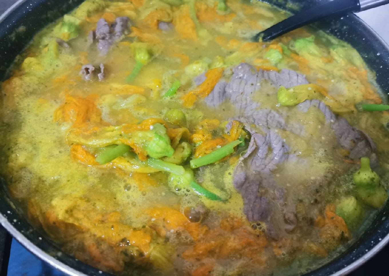 - Freír la cecina en una cazuela grande, agregar las flores de calabaza una vez medio marchitas incorporar la salsa verde