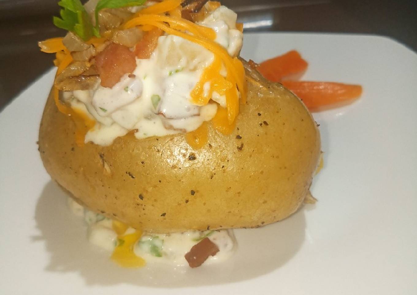 - Mezclar la crema, tocino y perejil y servir encima de la papa.